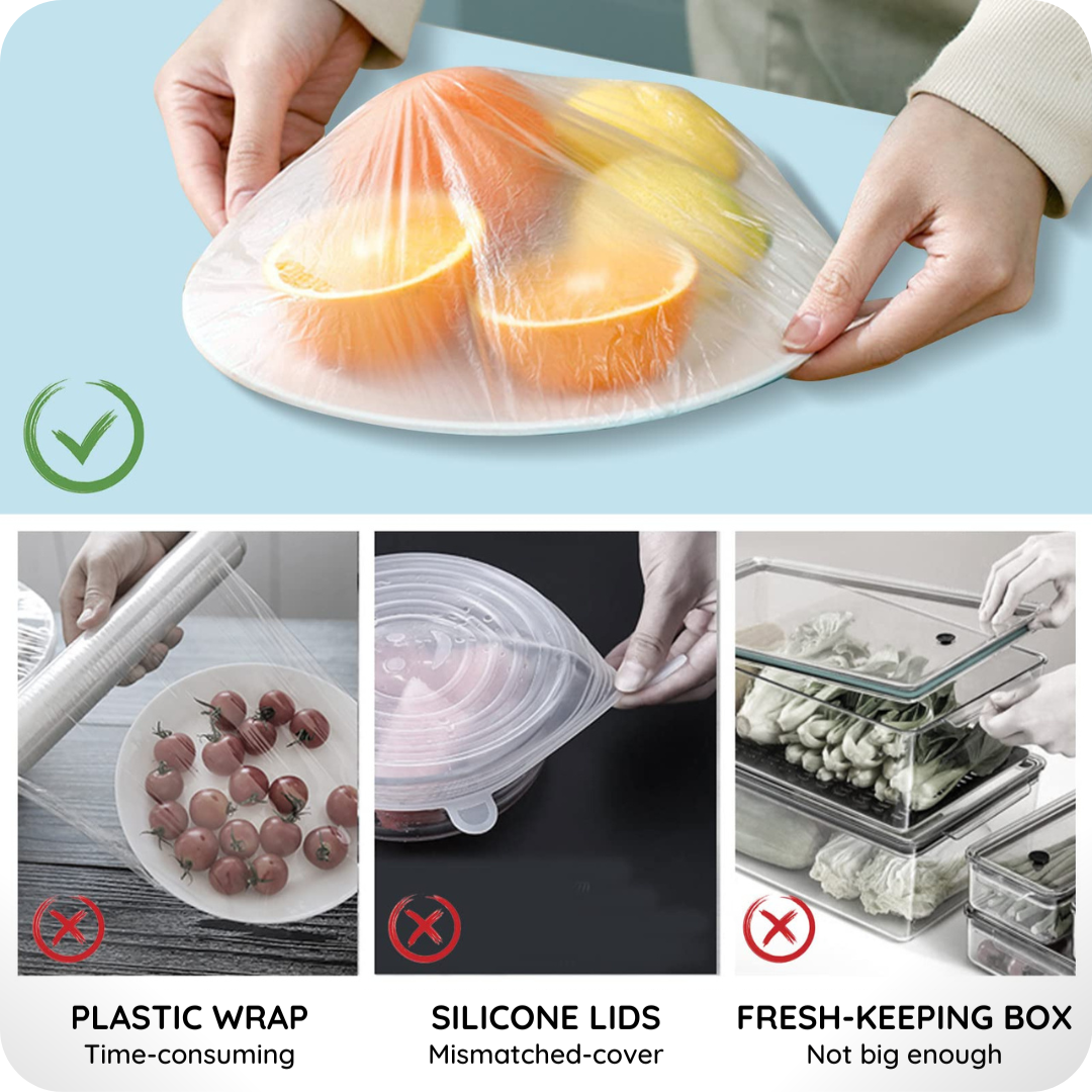 Unlike disposable wraps, it is reusable, fits varied sizes, and keeps food hygienic while being transparent for easy viewing